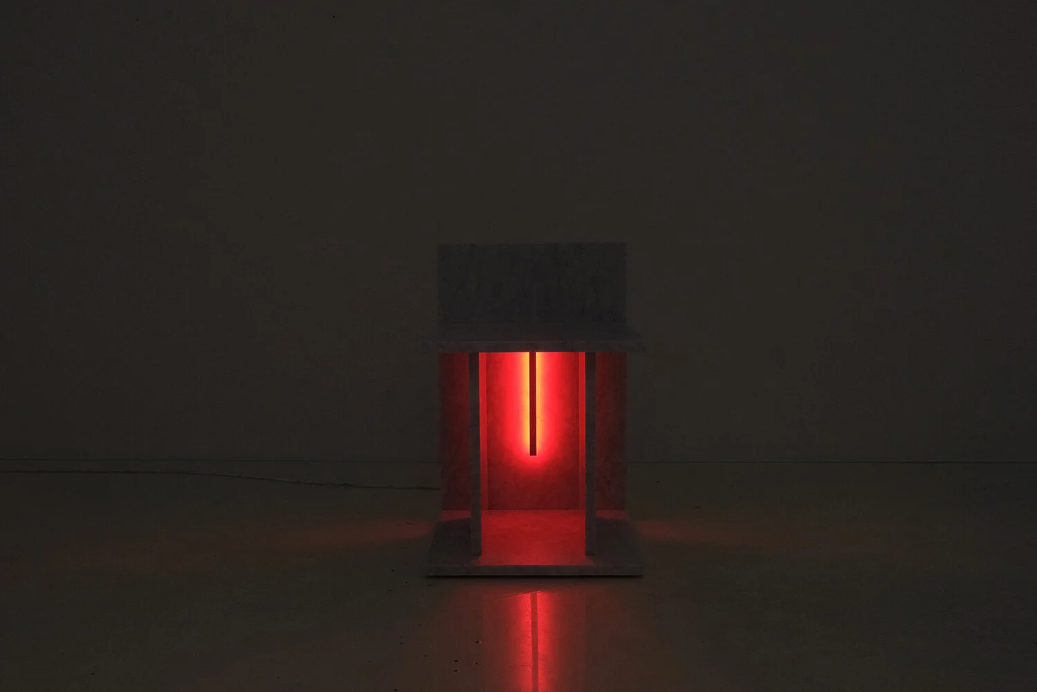Insular objects for an insular year. Pavilions I & II explore the meta, by being both furniture and architecture; space within space; structures within structures. Like a diorama or a dollhouse, Pavilions demonstrate the phenomenon of our human ability to change scale and conceptually experience space simply with our eyes. They are vessels designed to hold light. These slab marble objects can be utilized as a seat or table, or simply as spaces for the mind to occupy.
